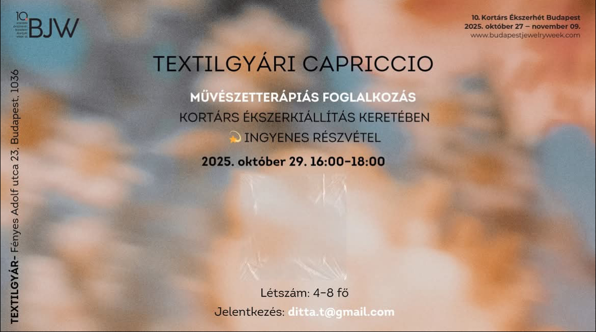 Ha kedvet érzel megtapasztalni, hogy mindez hogyan történik egy vezetett csoportfoglalkozás során, akkor jelentkezz erre az egyszeri művészetterápiás alkalomra. A Textilgyári Capriccio című ékszerkiállítás alkotásai között, biztonságos, elfogadó légkörben lehetőséged lesz a kiállított tárgyakhoz, a többi résztvevőhöz és önmagadhoz való kapcsolódásra.