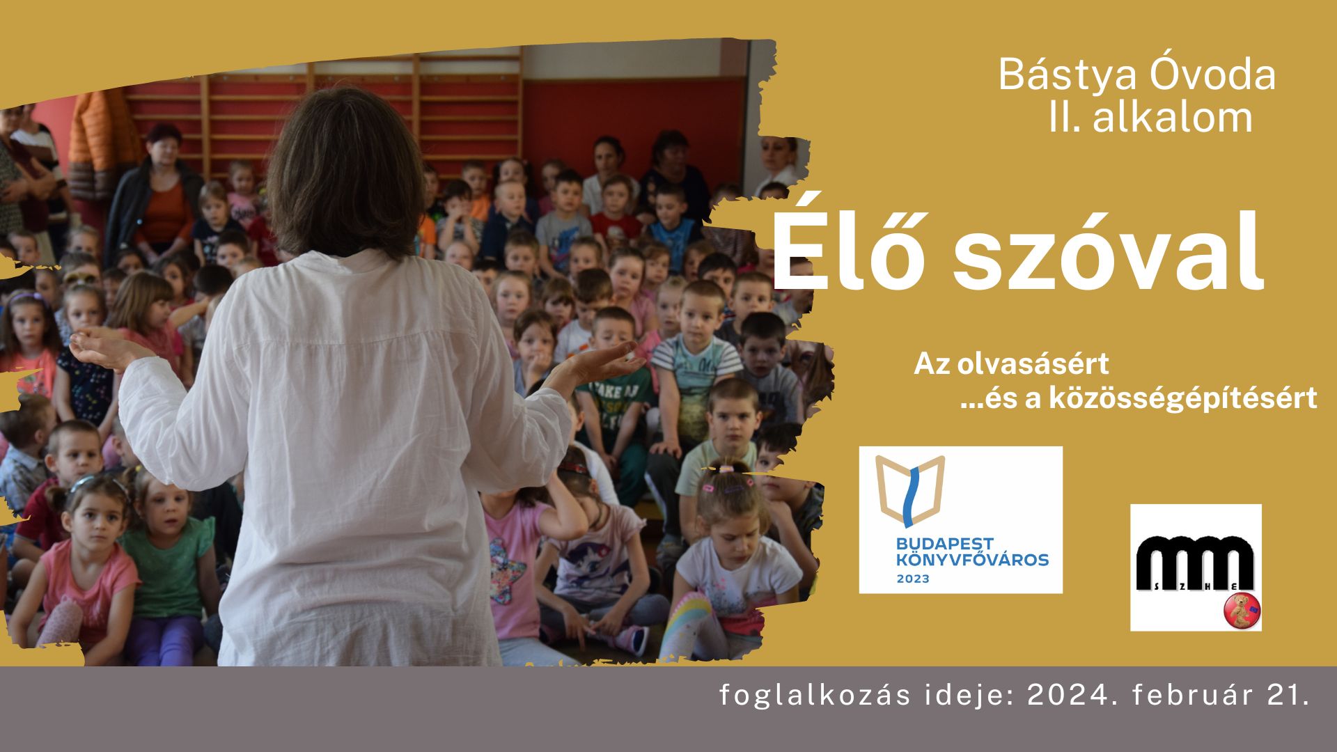 Bumberák Maja mesemondó, művészetterapeuta, a Magyar Művészet- és Szocioterápiás Közösségépítő Egyesület képviseletében tart két foglalkozást Budapesten a Bástya óvodában 2024. február 21-én. A rendezvény a Budapest 150 – Könyvfőváros 2023 eseménysorozat részeként valósul meg. Maja a foglalkozásokról így nyilatkozik: