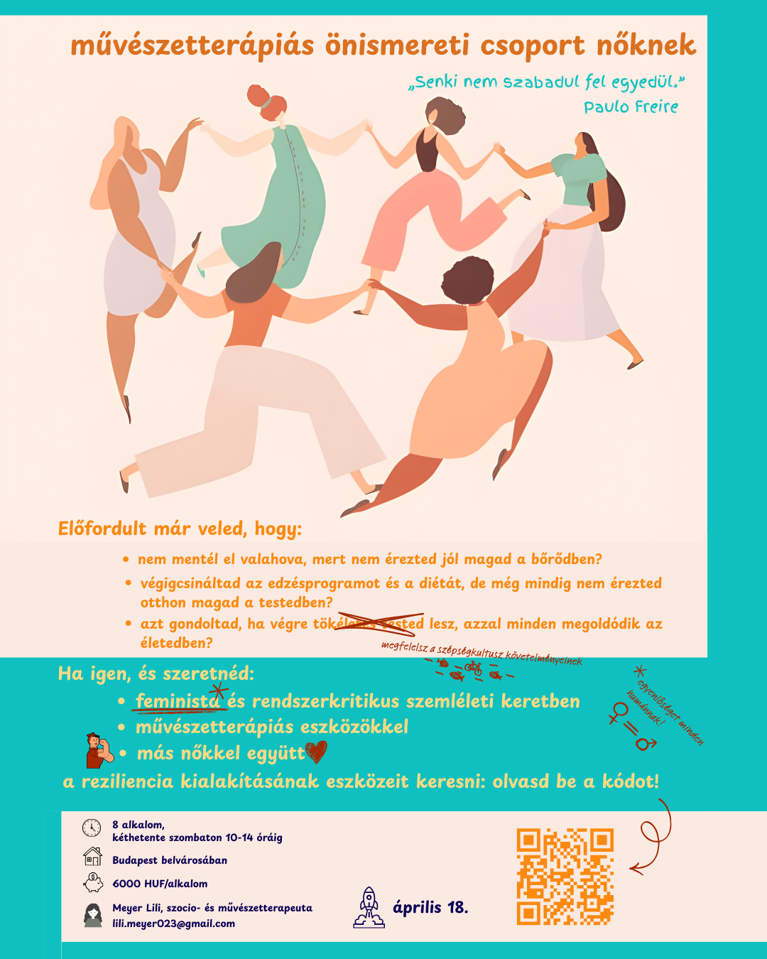 A saját testhez való viszony alapvetően meghatározó az életünkben. Kutatni, feltárni, megvizsgálni ezt a kapcsolatot, és ha úgy tartjuk fontosnak a változás irányába elmozdulni benne, nem egyemberes feladat. Jól jönnek a társak hozzá, amit a csoport mint forma, garantál. Ebben a 8 alkalmas zárt csoportfolyamatban a művészetterápia eszközeivel, feminista és rendszerkritikus szemléletben lesz alkalmad foglalkozni a témával.