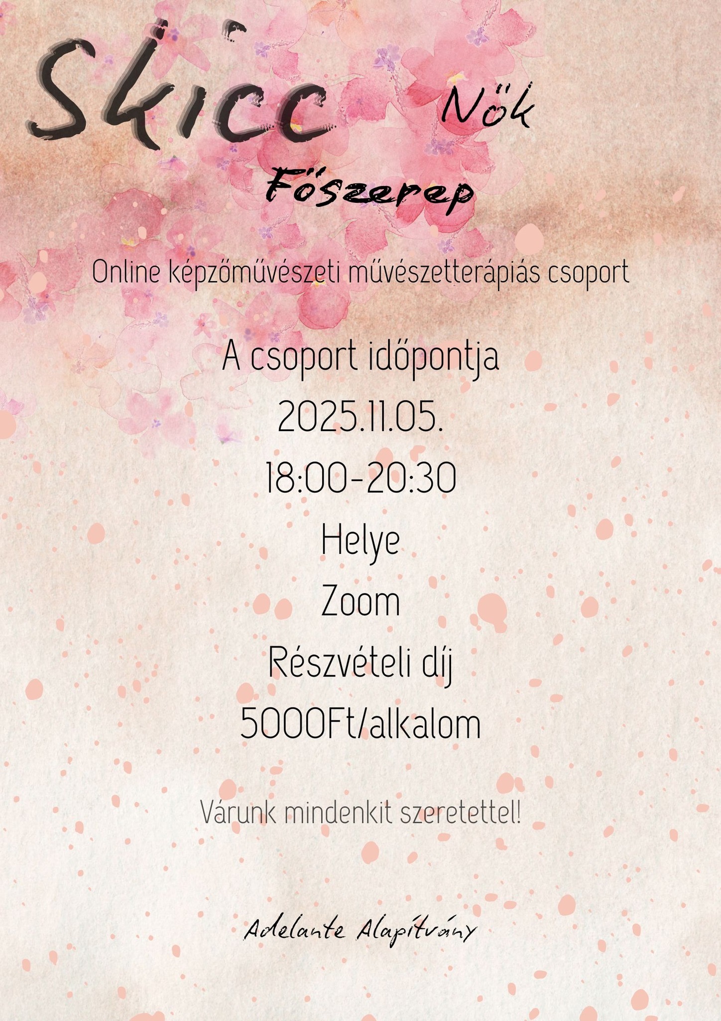 Célcsoport: 18-99 éves korig bárki részt vehet, aki szeretne megismerkedni a művészetterápiával, vagy úgy érzi elakadásaiban, kríziseinek megoldásában, stresszkezelésében, vagy egyéb terápiás folyamatainak kiegészítésében hasznos lehet.