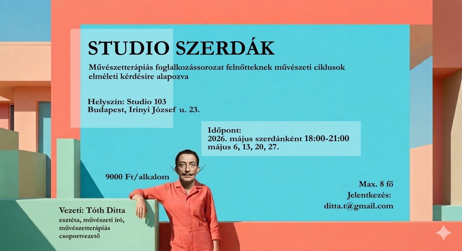 Ha kedved van megtapasztalni, hogy milyen, amikor a művészetterápiás foglalkozásokat a különböző művészeti ciklusok elméleti kérdéseivel és műalkotásaival alapozzuk meg és aktualizáljuk a saját személyes megéléseinkkel, alkotási folyamatainkkal, akkor jelentkezz a Studio Szerdák 4 alkalmas, felnőtteknek szóló csoportfolyamatra. Segítségül hívjuk majd többek között a szürrealizmus, az absztrakt expresszionizmus vagy akár a kortárs transzhumán problémafelvetéseit.